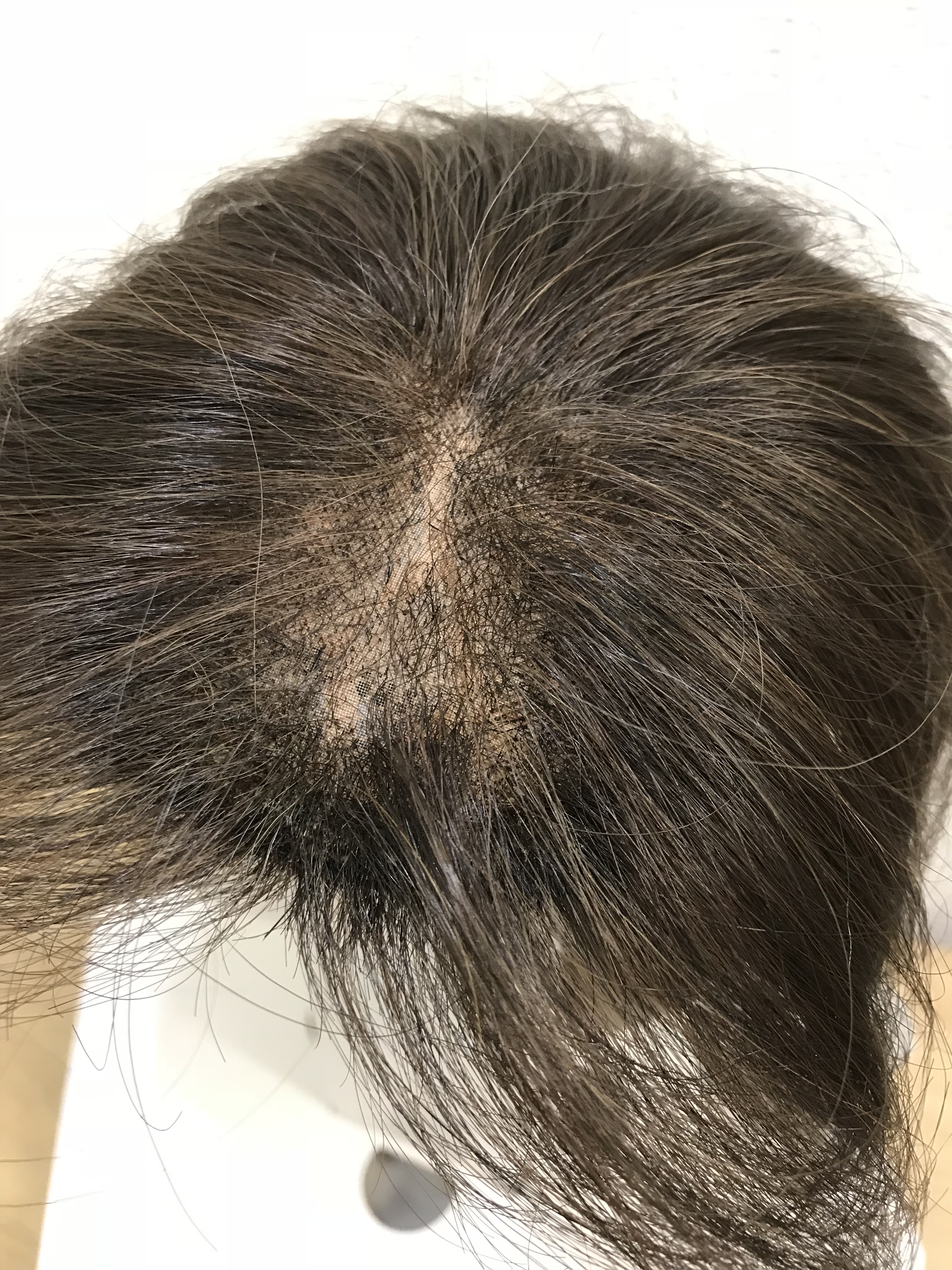 白髪染めをやめる事にしたので、使用ウィッグの毛も自毛と合う白髪ウィッグにリメイクしました。自毛の既染毛部が完全に無くなり写真のように完全な白髪になるには数年かかります。染をやめる方の多くは、白髪になるまではフルウィッグを使用される方が多いです。ご参考までに。
